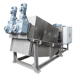 污泥在浓缩部经过重力浓缩后,被运输到脱水部,在前进的过程中随着滤缝及螺距的逐渐变小,以及背压板的阻挡作用下,产生极大的内压,容积不断缩小,达到充分脱水的目的。